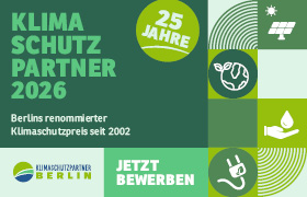 Haben Sie ein Klimaschutzprojekt in Berlin umgesetzt oder geplant? Bewerben Sie sich bis zum 5. April und werden Sie Klimaschutzpartner des Jahres 2026. Sichtbarkeit auf den Energietagen, Matching mit Hochschulen und Partnern und Chance auf den Publikumspreis (2.500 €). | | | |